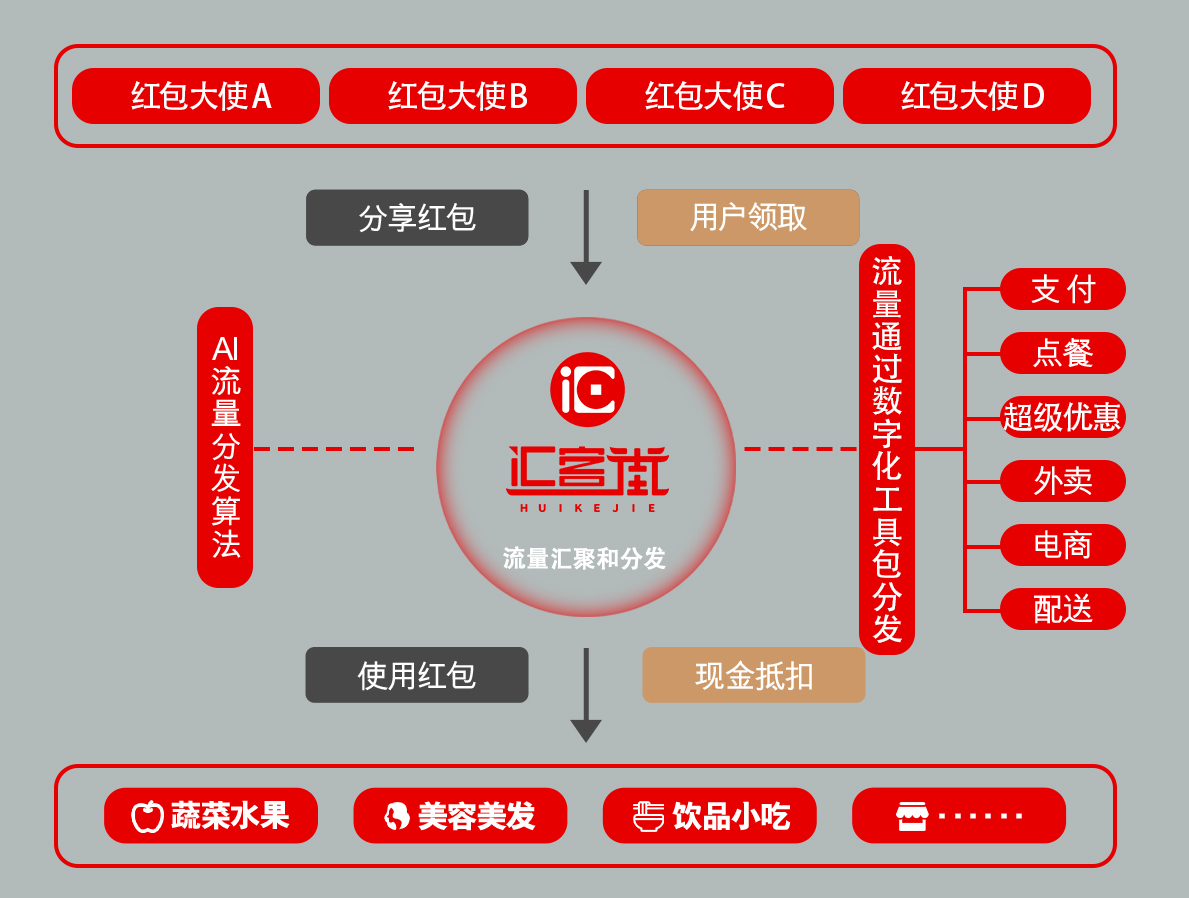 汇客街以流量为核心,创新性地将红包作为工具,通过消费者、商家多渠道派发现金红包的方式,将分散的异业流量高效汇聚到平台。平台利用AI算法一键匹配消费需求,把流量精准分发到周边商家,协助商家销售产品和服务,根据销售成果获取收益,实现消费者、商家、平台三方的互利共赢。